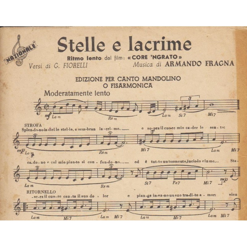 | Titolo: Stelle e Lacrime Autore/i: P. Fiorelli, Armando Fragna Genere/i: Moderato lento Strumento/i: Mandolino, Fisarmonica Raccolta di n° 1 brani Casa Editrice Nazionale |