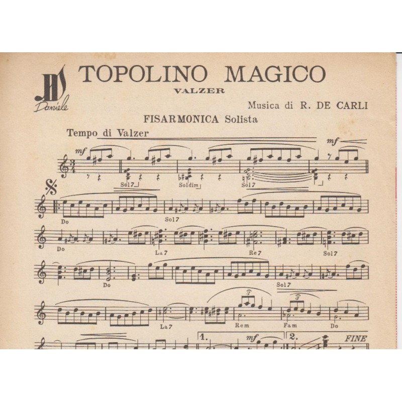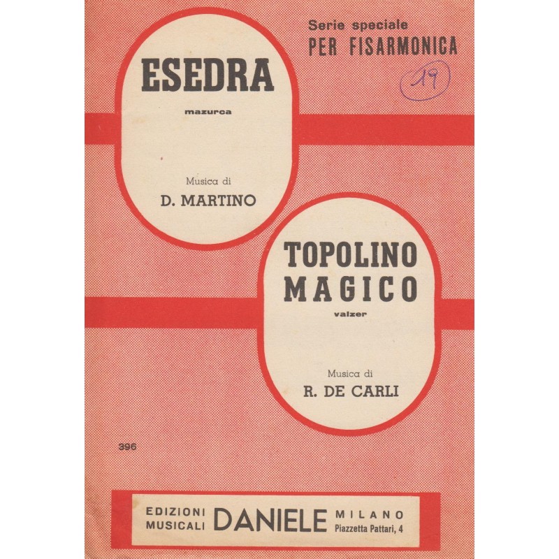 | Titolo: Esedra, Topolino Magico Autore/i: D. Martino, R. De. Carli Genere/i: mazurca, valzer Strumento/i: Fisarmonica Raccolta di n° 2 brani Edizioni Musicali Daniele |