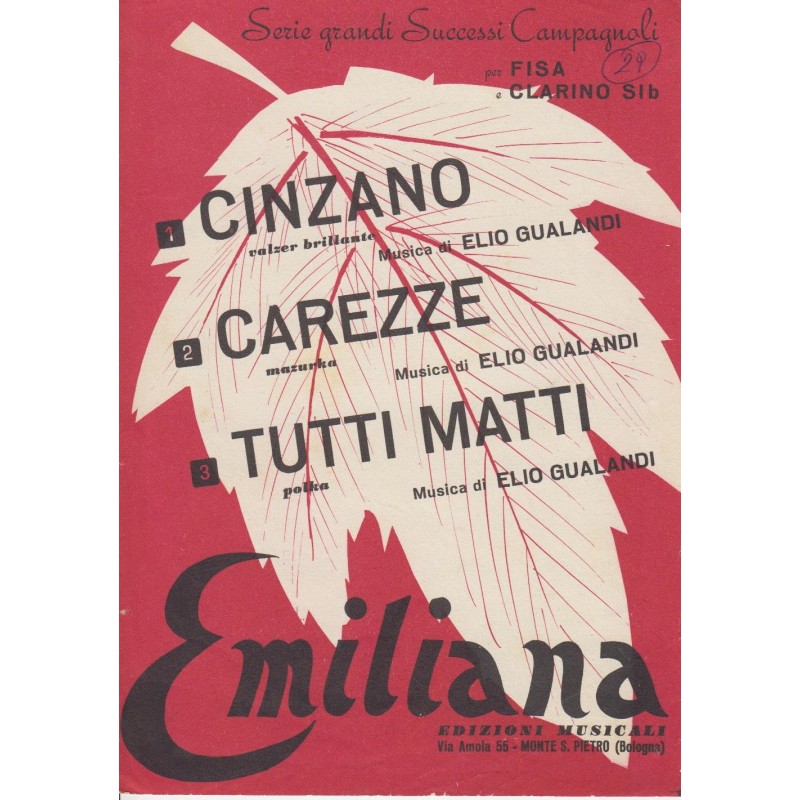 | Titolo: Cinzano, Carezze, Tutti Matti Autore/i: Elio Gualandi Genere/i: Valzer brillante, mazurka, polka Strumento/i: Fisarmonica Raccolta di n° 3 brani Edizioni Musicali Emiliana |