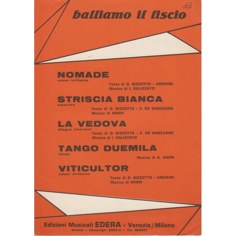 | Titolo: Nomade, Striscia Bianca, La Vedova, Tango Duemila, Viticultor Autore/i: D. Bizzotto, Umerini, I. Salizzato, E. De Sanzuane, A. Caon, Umerini Genere/i: Valzer brillante, mazurka, allegro, tango, valzer brillante Strumento/i: Fisarmonica Raccolta di n° 5 brani Edizioni musicali Edera |
