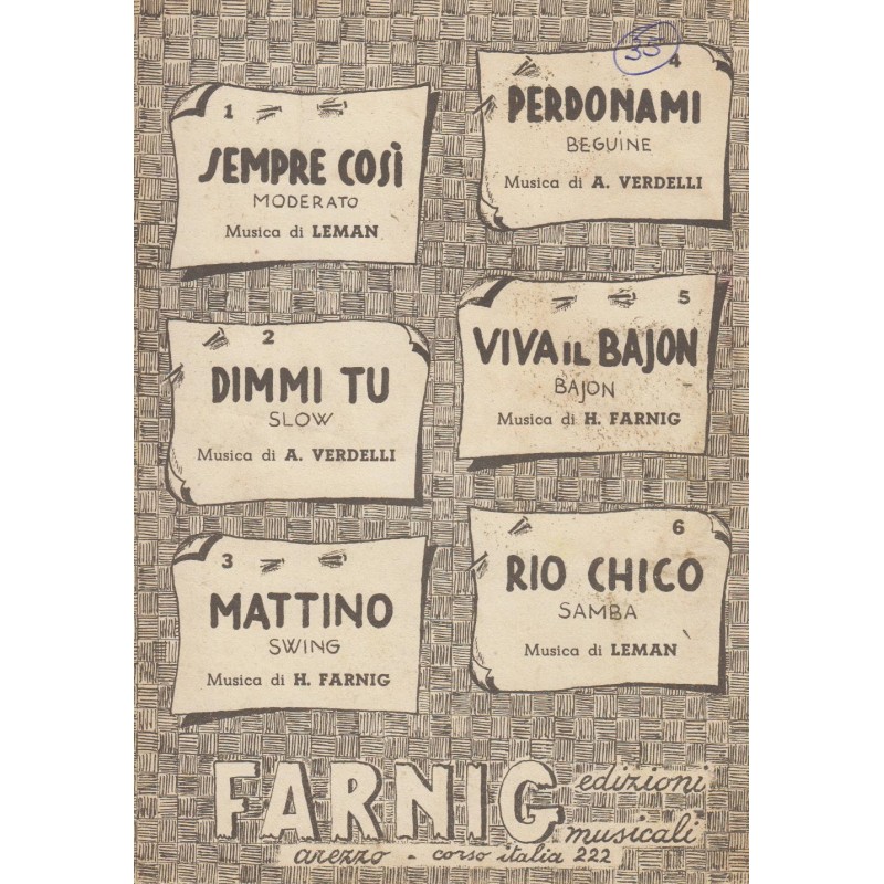 | Titolo: Sempre così, Perdonami, Dimmi tu, Viva il Bajon, Mattino, Rio Chico Autore/i: Leman, A. Verdelli, H. Farning, Genere/i: Moderato , beguine, slow, bajon, swing, samba, Strumento/i: Fisarmonica, violino Raccolta di n° 6 brani Edizioni Musicali Farnig |