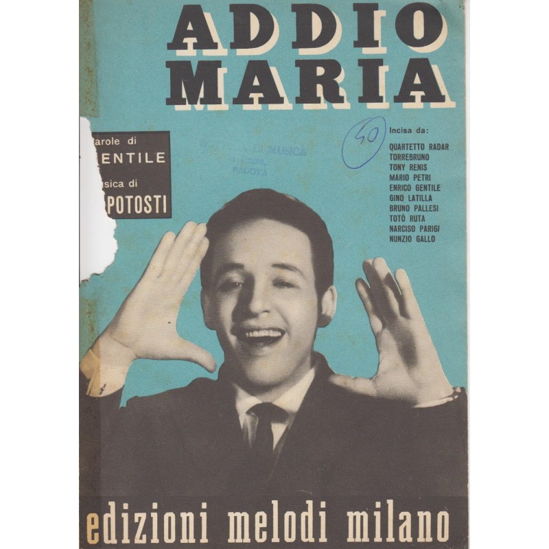 | Titolo: Addio Maria Autore/i: Gentile, Capotosti Genere/i: Strumento/i: Mandolino, Fisarmonica Raccolta di n° 1 brani Edizioni Musicali Melodi Milano |