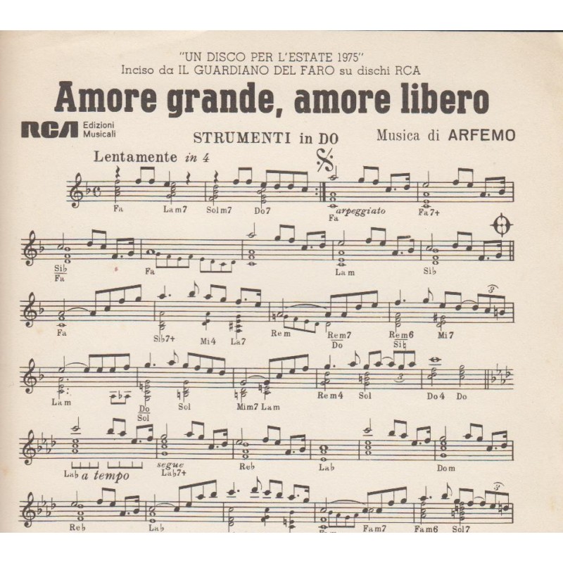 | Titolo: Amore grande, amore libero Autore/i: Arfemo Genere/i: Strumento/i: Raccolta di n° 1 brani Edizioni Musicali RCA |