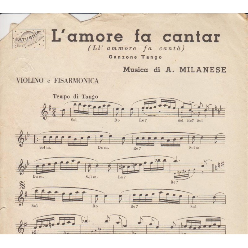 | Titolo: L'Amore Fa Cantar, Senza Lacrime Autore/i: M. Teri, A. Milanese, G. Giocca, A. Milanese Genere/i: tango Strumento/i: Violino, Fisarmonica Raccolta di n° 2 brani Edizioni Musicali Saturnia |