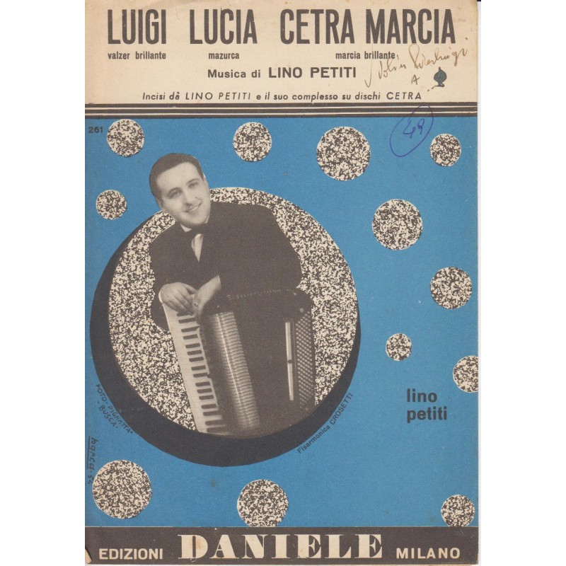 | Titolo: Luigi, Lucia, Cetra Marcia Autore/i: Lino Petiti Genere/i: Valzer brillante, mazurca, marcia brillante Strumento/i: Fisarmonica Raccolta di n° 3 brani Edizioni Musicali Daniele |