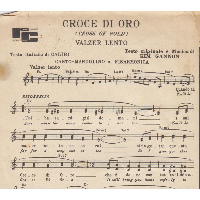 | Titolo: Croce di Oro Autore/i: Calibi, Kim Gannon Genere/i: valzer lento Strumento/i: Mandolino, Fisarmonica Raccolta di n° 1 brani Edizioni Musicali Ritmi e Canzoni |