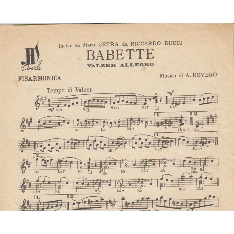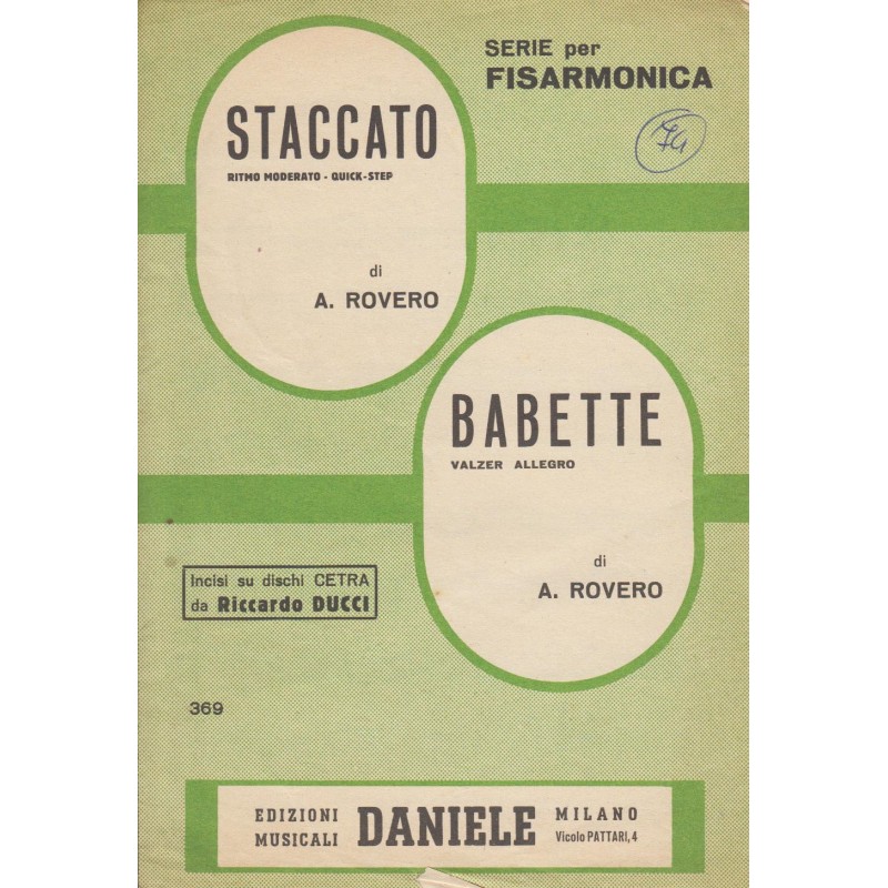 | Titolo: Staccato, Babette Autore/i: A. Rovero, Genere/i: ritmo moderato, quick step, valzer allegro Strumento/i: Fisarmonica Raccolta di n° 2 brani Edizioni Musicali Daniele |