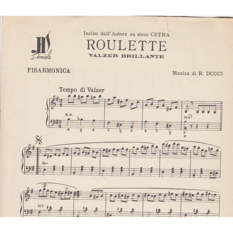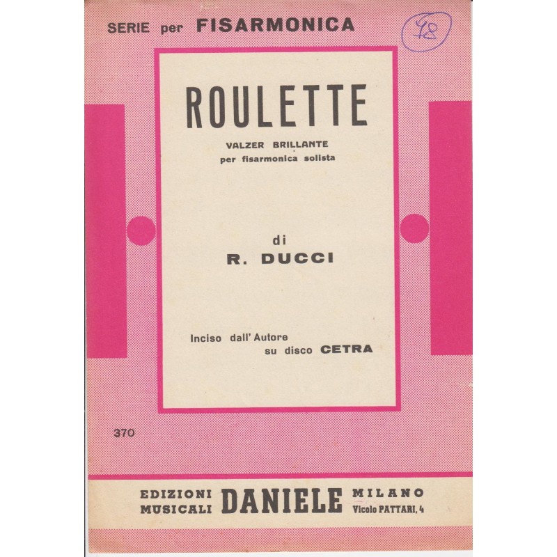 | Titolo: Roulette Autore/i: R. Ducci, Genere/i: Valzer Brillante, Polca Strumento/i: Fisarmonica Raccolta di n° 1 brani Edizioni Musicali Daniele |