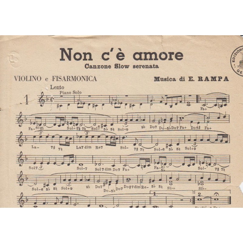 | Titolo: Non c'è amore, Nel Boschetto, Autore/i: E. Rampa, G. Manzotti, Genere/i: slow serenata, fox moderato, Strumento/i: Violino, Fisarmonica Raccolta di n° 2 brani Edizioni Musicali Genova |