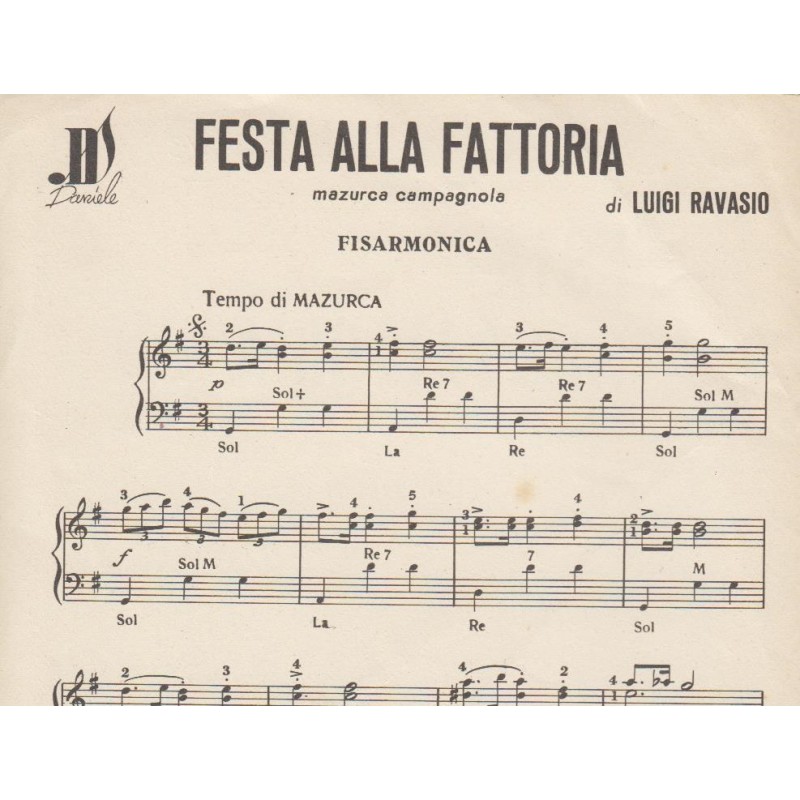 | Titolo: Festa alla Fattoria Autore/i: L. Ravasio, F. Foglia Genere/i: mazurca campagnola Strumento/i: Fisarmonica Raccolta di n° 1 brani Edizioni Musicali Daniele Milano |