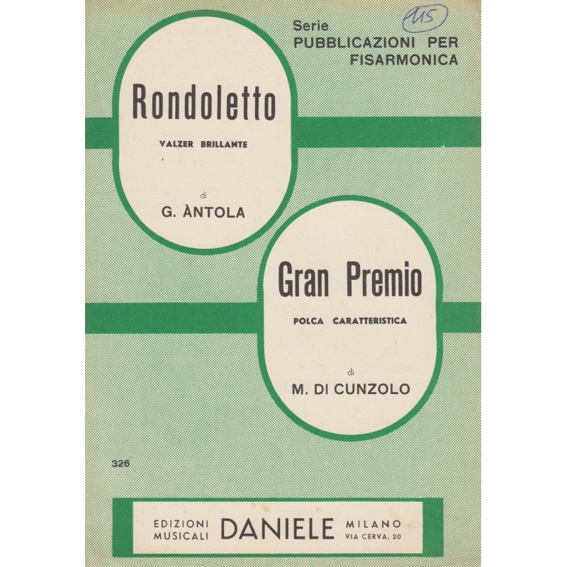 | Titolo: Rondoletto, Gran Premio Autore/i: G. Antola, M. di Cunzolo Genere/i: Valzer Brillante, Polca caratteristica Strumento/i: Fisarmonica Raccolta di n° 2 brani Edizioni Musicali Daniele Milano |