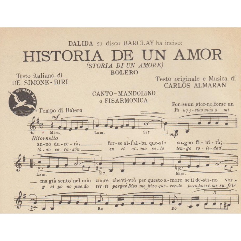 | Titolo: Historia de un amor Autore/i: Simone, Biri, Carlos Almaran Genere/i: bolero Strumento/i: Mandolino, Fisarmonica Raccolta di n° 1 brani Edizioni Southern Music |