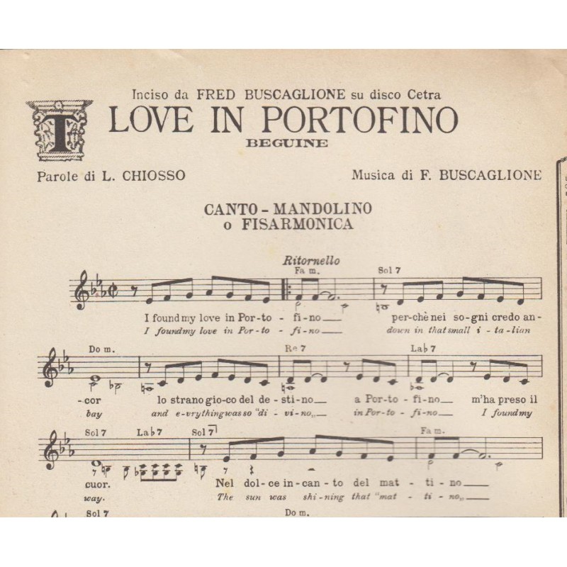 | Titolo: Love in Portofino Autore/i: Fred Buscaglione, L. Chiosso Genere/i: Beguine, Strumento/i: Mandolino, Fisarmonica Raccolta di n° 1 brani Edizioni Musicali Tevere Milano |