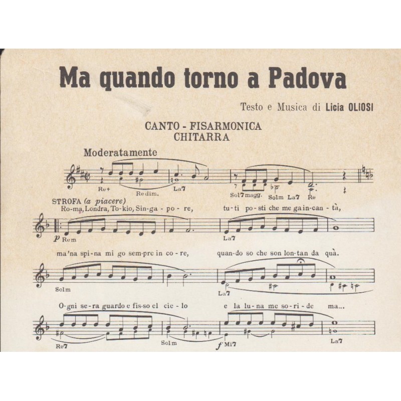 | Titolo: Ma quando torno a Padova Autore/i: Licia Oliosi Genere/i: moderato Strumento/i: Fisarmonica, chitarra Raccolta di n° 1 brani Edizioni Musicali G. Zanibon |