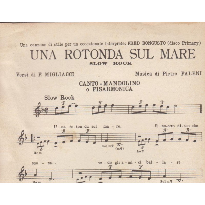 | Titolo: Una Rotonda sul Mare Autore/i: F. Migliacci, Pietro Faleni Genere/i: slow rock Strumento/i: Mandolino, Fisarmonica Raccolta di n° 1 brani Edizioni Musicali La Bussola Milano |