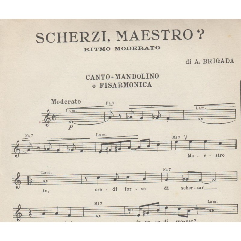 | Titolo: Scherzi maestro? Autore/i: A. Brigada Genere/i: ritmo moderato Strumento/i: Mandolino, Fisarmonica Raccolta di n° 1 brani Edizioni Musicali Sabaudia Torino |