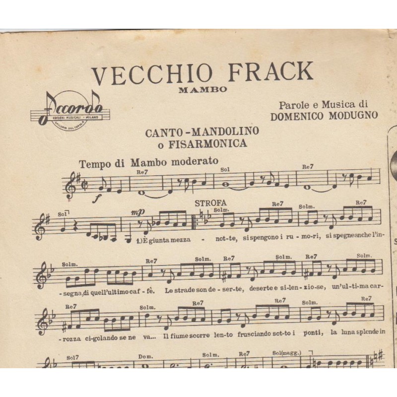 | Titolo: Vecchio Frack Autore/i: Domenico Modugno Genere/i: mambo, Strumento/i: Mandolino, Fisarmonica Raccolta di n° 1 brani Edizioni Musicali Accordo Milano |