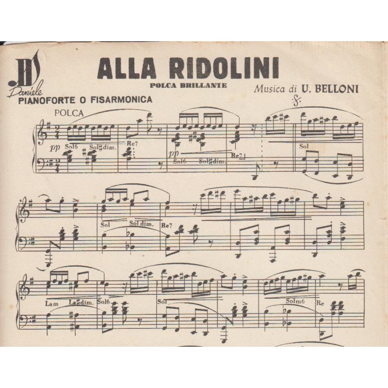 | Titolo: Alla ridolini Autore/i: U. Belloni Genere/i: polca brillante Strumento/i: Pianoforte, Fisarmonica Raccolta di n° 1 brani Edizioni DANIELE Milano |