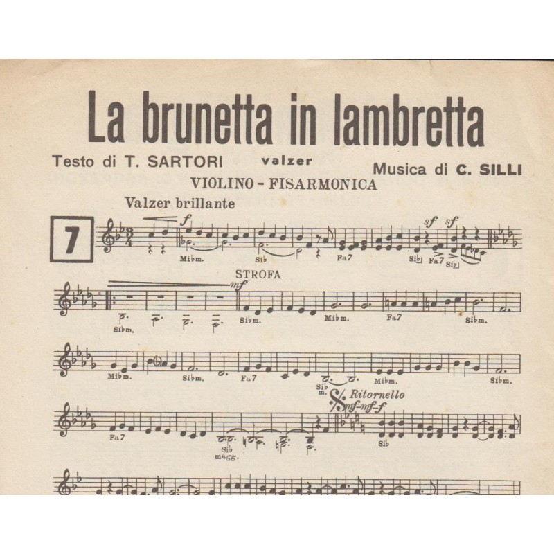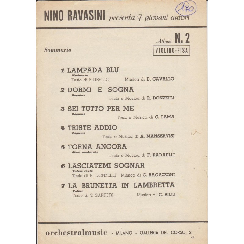 | Titolo: Lampada Blu, Dormi e Sogna, Sei tutto per me, Triste addio, Torna ancora, lasciatemi sognar, la brunetta in lambretta Autore/i: D. Cavallo, R. Donzelli, C. Lama, A. Manservisi, F. Radaelli, C. Ragazzoni, C. Silli Genere/i: valzer, slow moderato Strumento/i: Violino, Fisarmonica Raccolta di n° 7 brani Edizioni Musicali Orchestralmusic Milano |