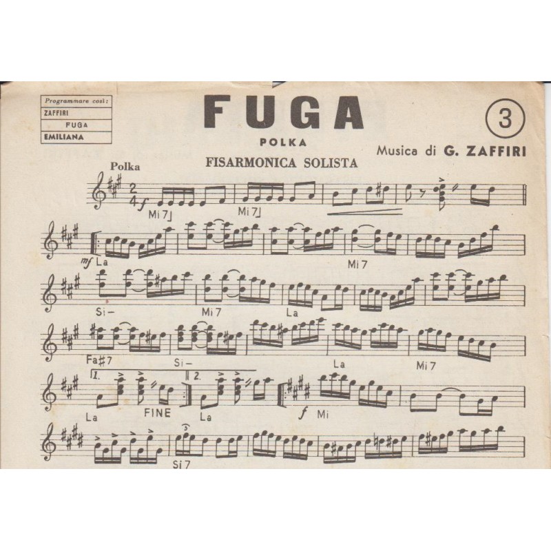 | Titolo: Diamante, Pineta, Fuga Autore/i: G. Zaffiri Genere/i: valzer variato, mazurka, polka Strumento/i: Fisarmonica Raccolta di n° 3 brani Edizioni Musicali Emiliana |