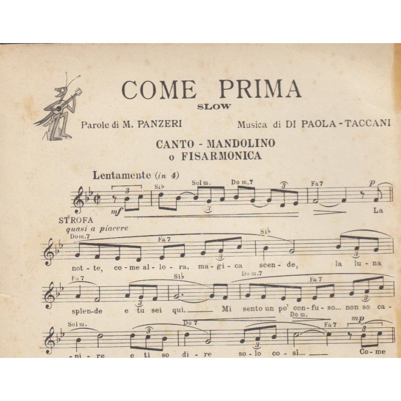 | Titolo: Come prima Autore/i: Di Paola, Taccani Genere/i: Slow Strumento/i: Mandolino, Fisarmonica Raccolta di n° 1 brani Edizioni La Cicala Milano |