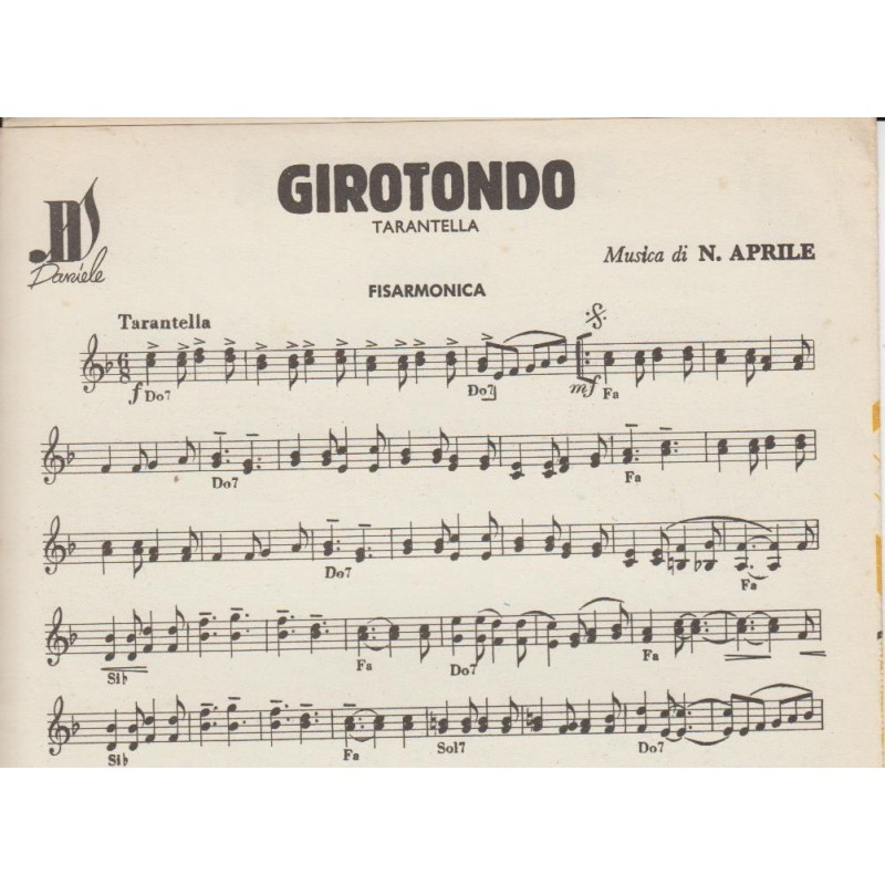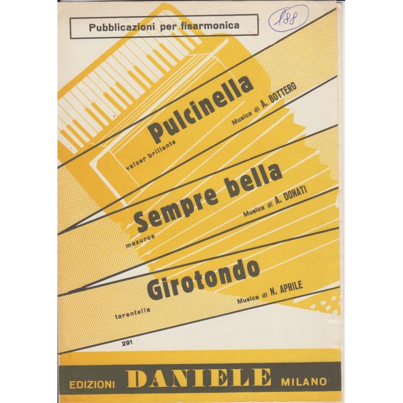 | Titolo: Pulcinella, Sempre Bella, Girotondo Autore/i: A. Bottero, A. Donati, N. Aprile Genere/i: valzer brillante, mazurka, tarantella Strumento/i: Fisarmonica Raccolta di n° 3 brani Edizioni Musicali Daniele Milano |