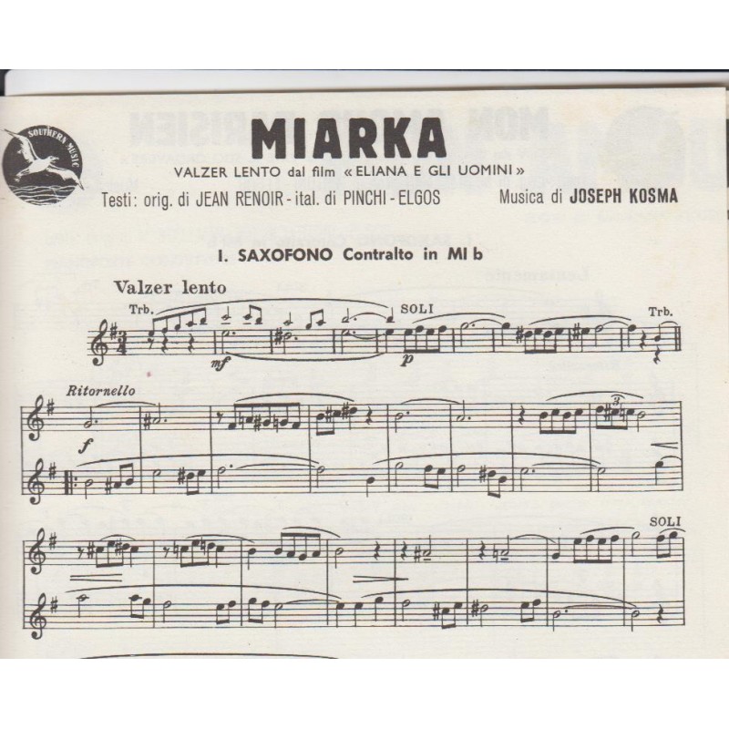 | Titolo: Mon Amour Parisien, Miarka Autore/i: M. Stellman, G.C. Testoni – Elgos, Philip Green, Jean Renoir, Pinchi, Elgos, Joseph Kosma, Genere/i: Slow Strumento/i: Pianoforte, saxofono, Violino, Fisarmonica Raccolta di n° 2 brani Edizioni Southern Music |