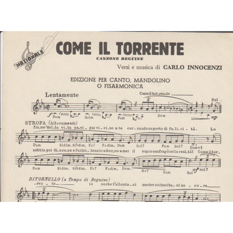 | Titolo: Come il Torrente Autore/i: Carlo Innocenzi Genere/i: Beguine, Strumento/i: Mandolino, Fisarmonica Raccolta di n° 1 brani Casa Editrice Musicale Nazionale |