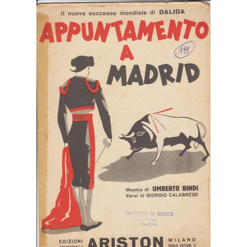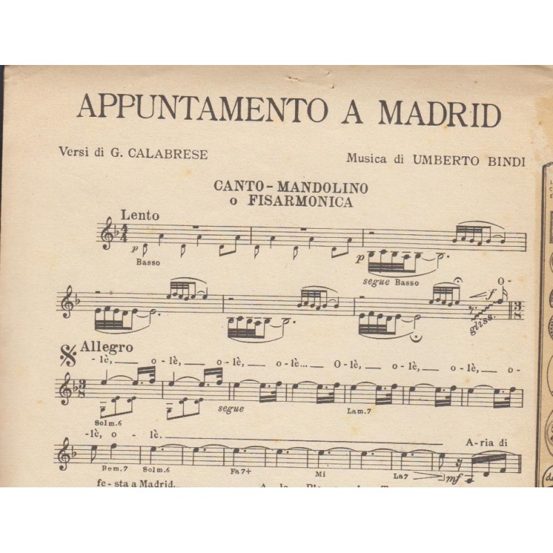 | Titolo: Appuntamento a Madrid Autore/i: Umberto Bindi, Giorgio Calabrese Genere/i: Lento, Strumento/i: Mandolino, Fisarmonica Raccolta di n° 1 brani Edizioni Musicali Ariston Mialno |