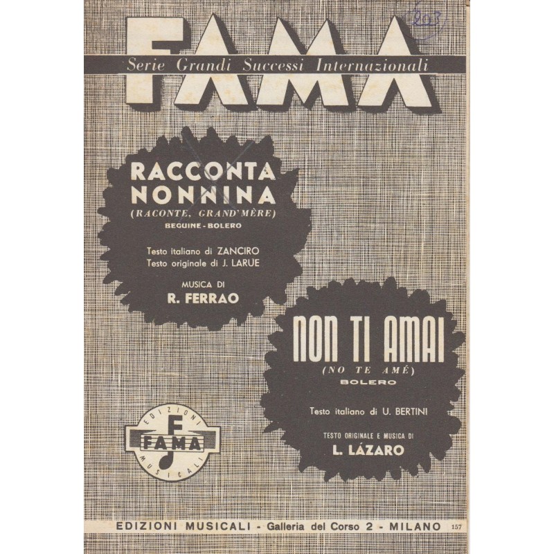 | Titolo: Racconta nonnina, Non ti amai Autore/i: Zanciro, J. Larue, U. Bertini, L. Lazzaro Genere/i: beguine, bolero, Strumento/i: Violino, Fisarmonica Raccolta di n° 2 brani Edizioni Musicali Fama |
