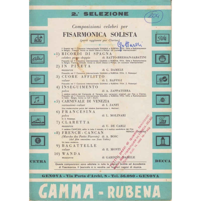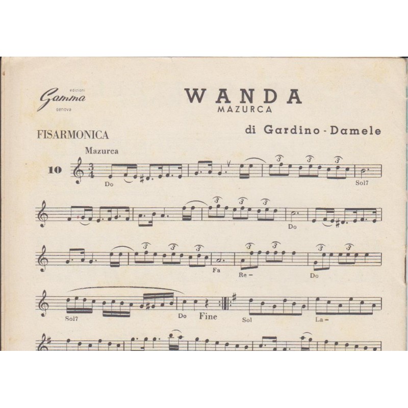 | Titolo: Ricordi di Spagna Autore/i: Ratto, Bressan, Sabatini, G. Damele, I. Baffigi, A. Zappaterra, I. Zanfi, L. Molinari, U. De Carli, A. Bosc, Ratto, Bressan, Sabatini, A. Bosc, E. Monti, Gardino, Damele Genere/i: passo doppio, mazurca, polca, valzer Strumento/i: Fisarmonica Raccolta di n° 10 brani Edizioni Musicali GAMMA |