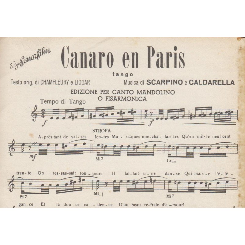 | Titolo: Canaro en Paris Autore/i: Scarpino, Caldarella Genere/i: Tango Strumento/i: Mandolino, Fisarmonica Raccolta di n° 1 brani Edizioni Musicali Sonorfilm |